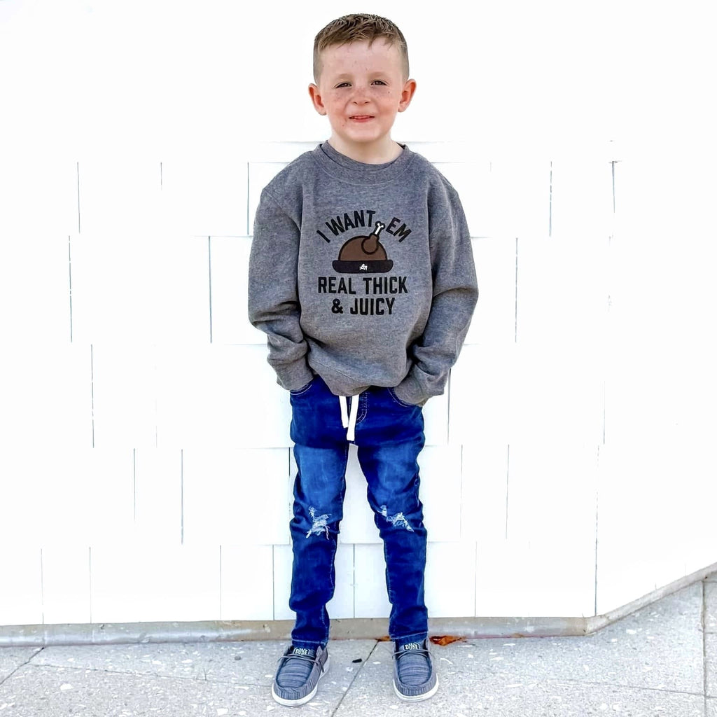 Let your little ones show their love for Turkey & Thanksgiving with this new exclusively designed kids 'I want 'em real thick & juicy' crewneck sweatshirt from Ledger Nash Co.