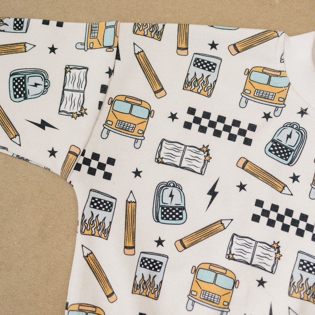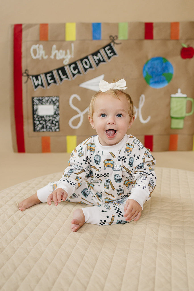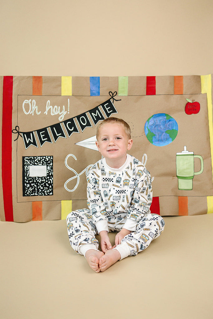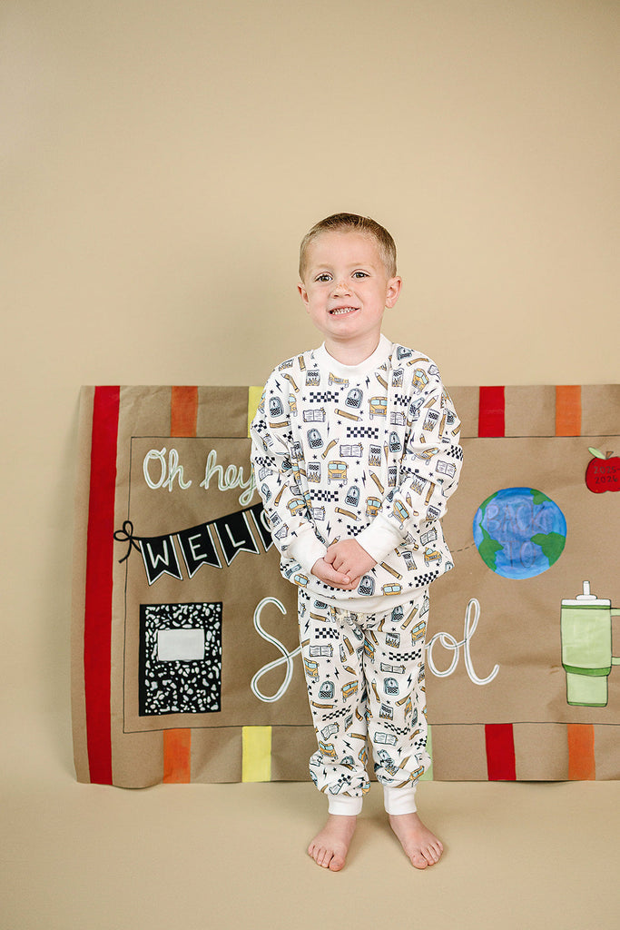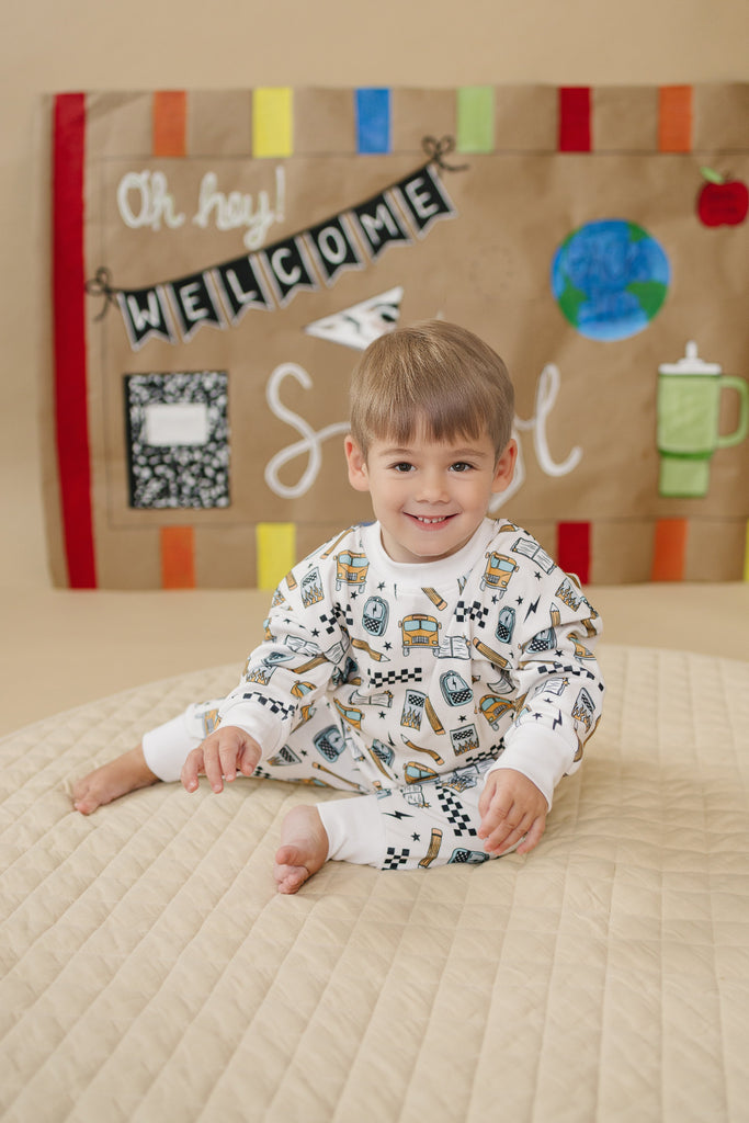 Notebooks, pencils, lightning bolts, and school buses. The Jogger Set | Back 2 Cool brings all the classroom energy in one bold, comfy set. Perfect for first day pics, hallway walks, and snack-time chill.